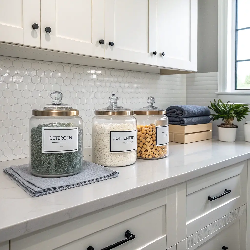 Okay, I know what you’re thinking – “decorative” and “laundry room” don’t usually go together. But switching to glass jars with labels for detergent pods, dryer balls, and clothespins actually makes sense beyond just looking pretty.