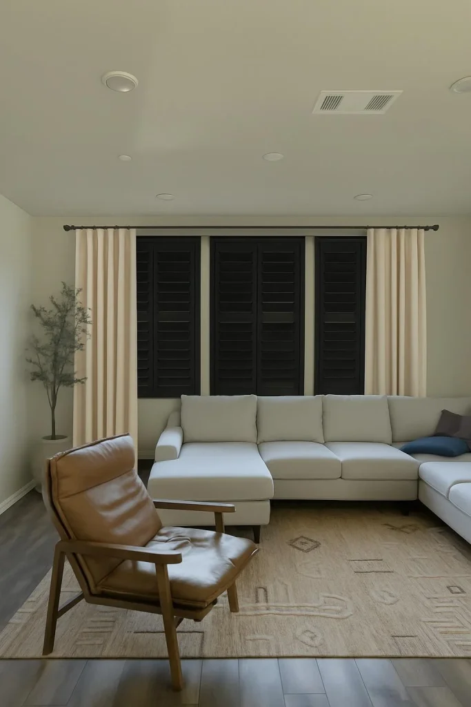 Here’s a setup that takes things in a completely different direction. r/xrayxray19 paired creamy linen curtains with bold black shutters, creating a striking contrast that feels both modern and cosy.