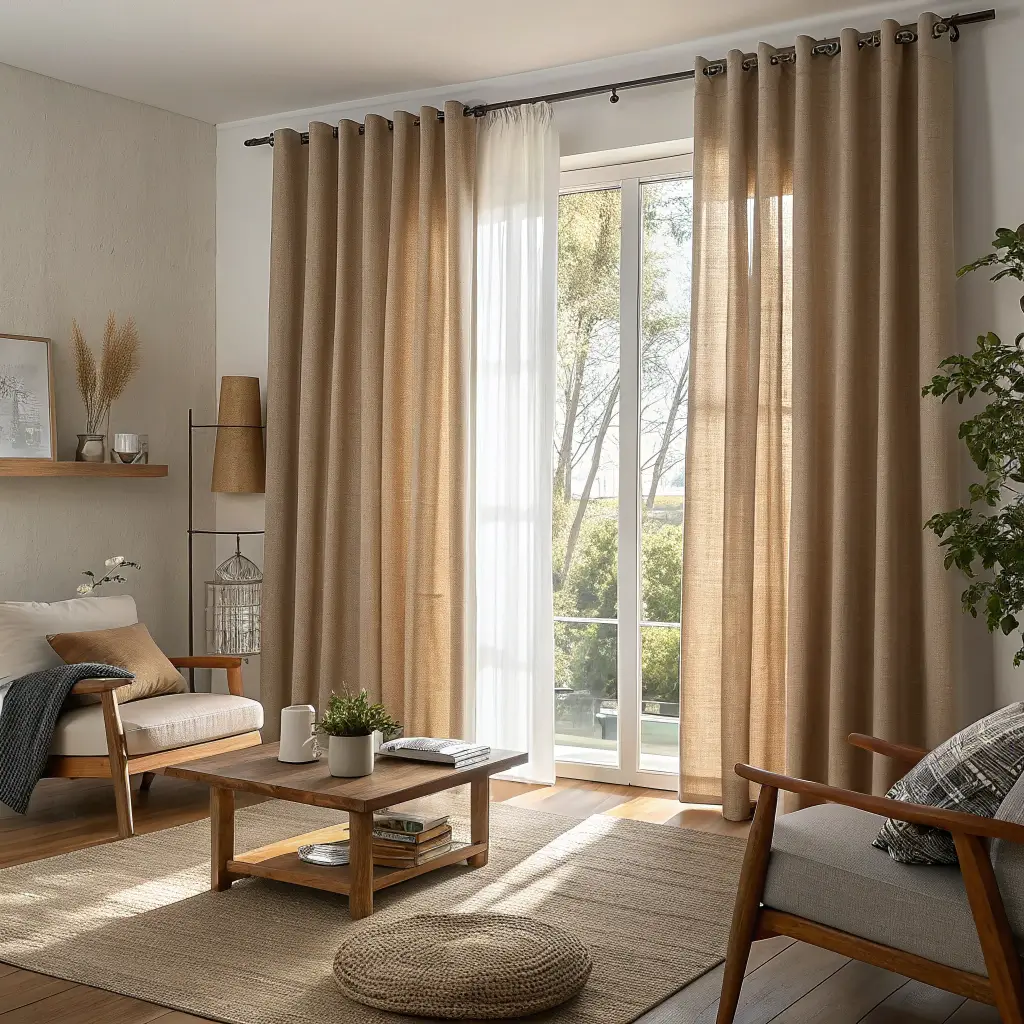 Natural, earthy curtains bring the outside in without the bugs and pollen. We’re talking warm browns, soft tans, and muted greens that make your living room feel grounded and serene.