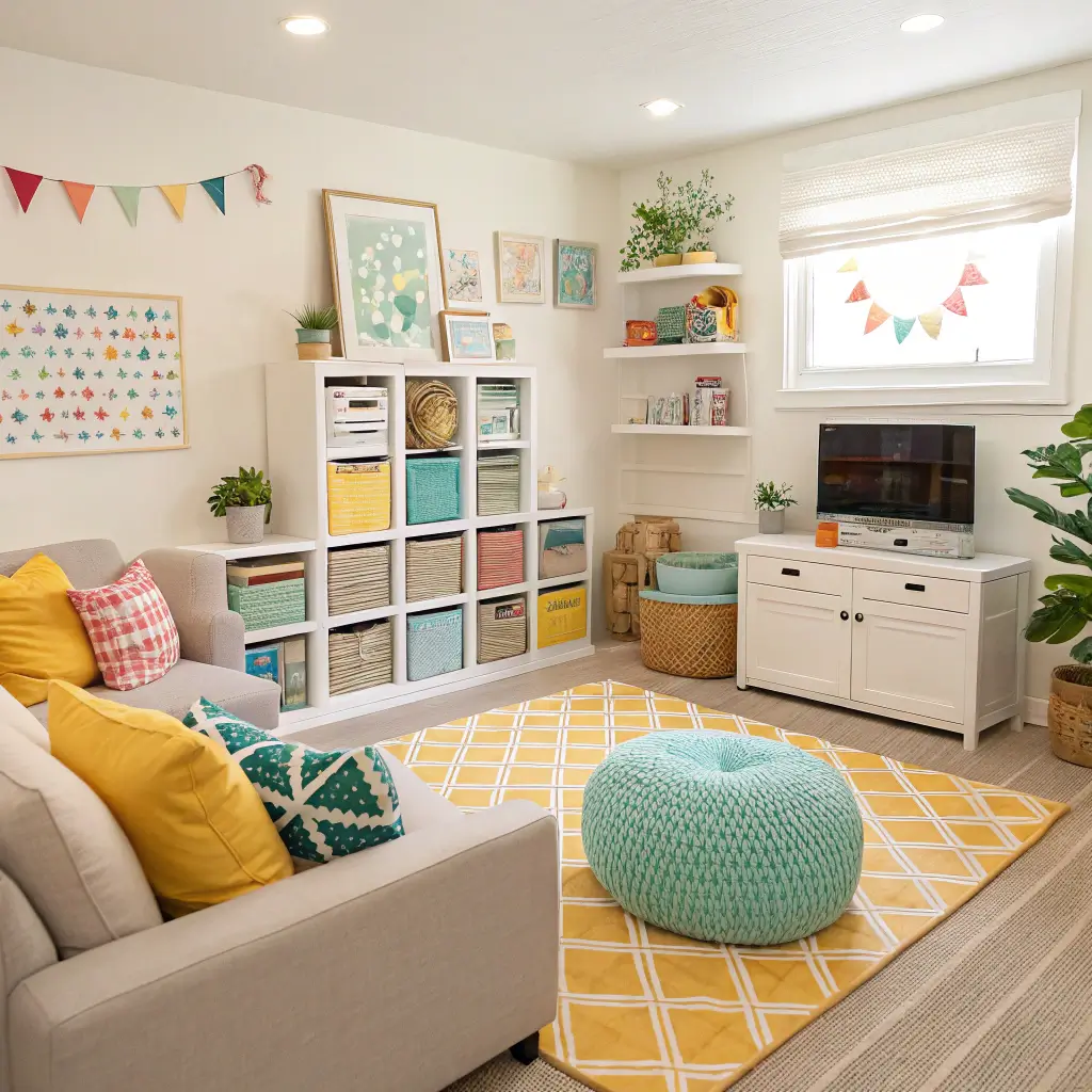 Create zones for different activities – maybe a reading nook, a game area, and a TV watching spot. Everyone gets their space, and the room doesn’t descend into chaos.