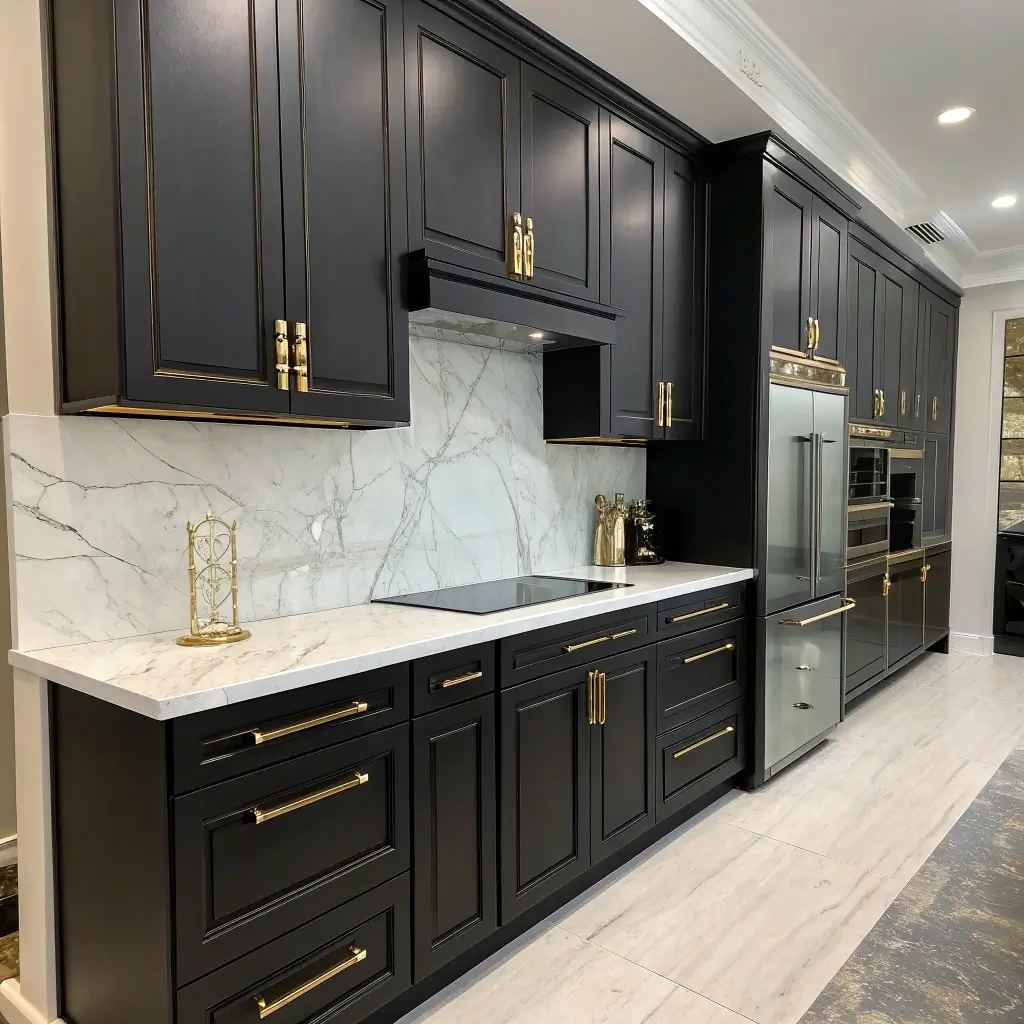 Sleek Black Cabinets with Gold Accents