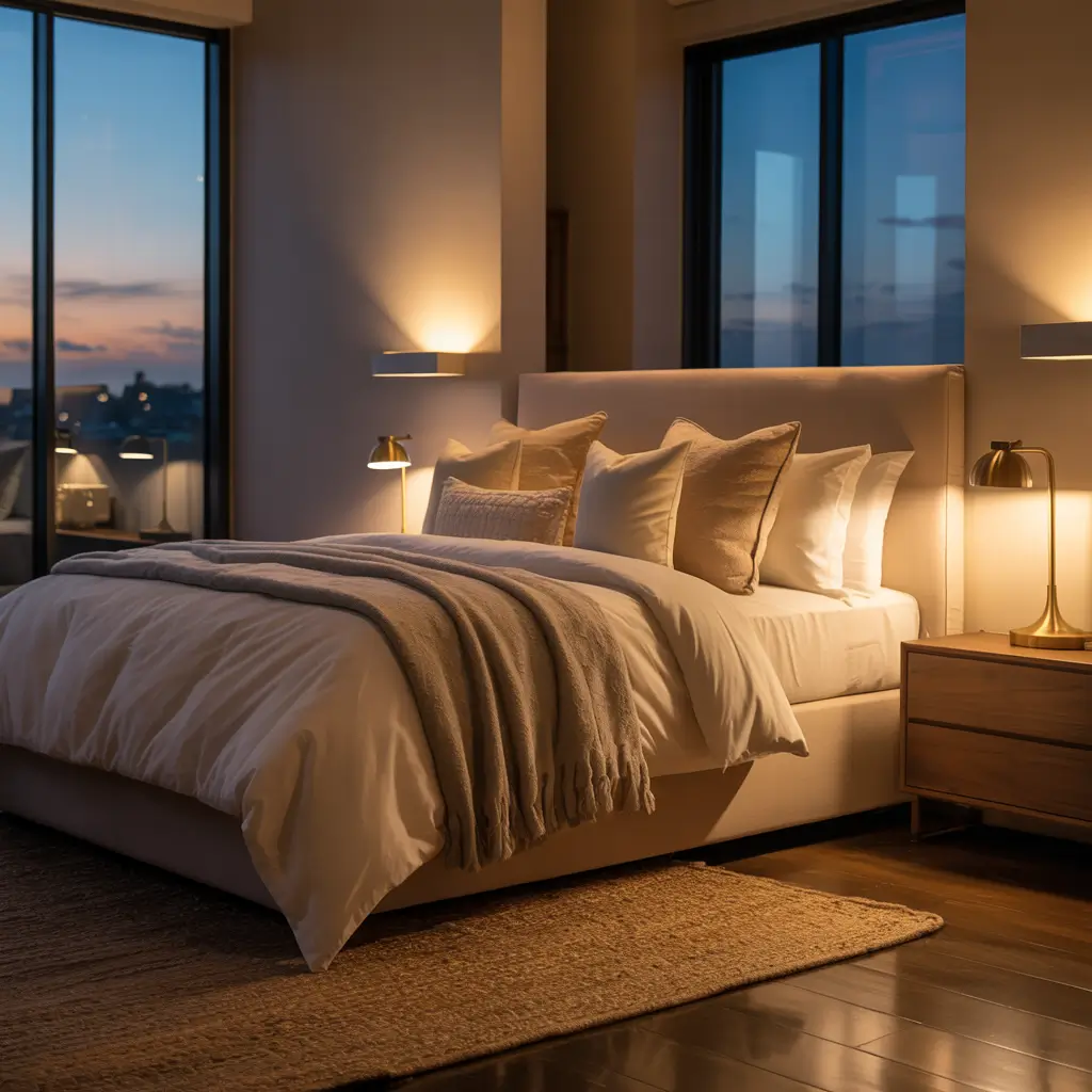 Then focus on adding multiple light sources at different heights. Table lamps on nightstands, a floor lamp in the reading corner, and maybe some string lights or LED strips behind the headboard.