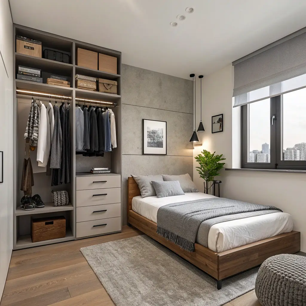 • Integrated storage solutions like beds with built-in drawers