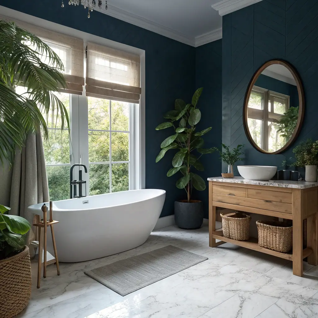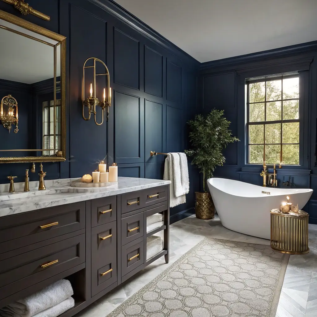 The key to nailing this look lies in balance. You don’t want your bathroom to feel like a cave (unless you’re into that, no judgment). Instead, think of midnight blue as your anchor color while incorporating softer elements that keep things light and breathable.