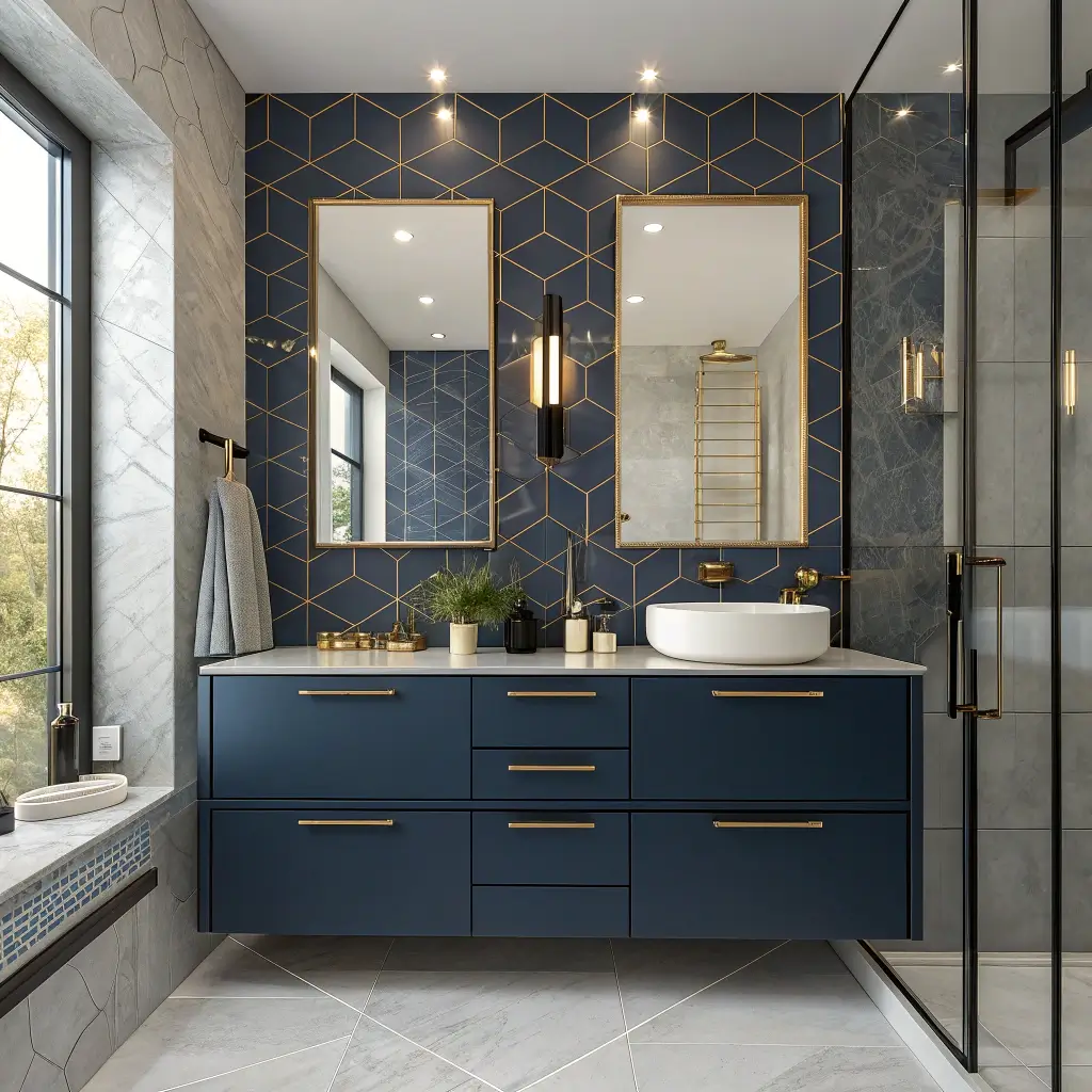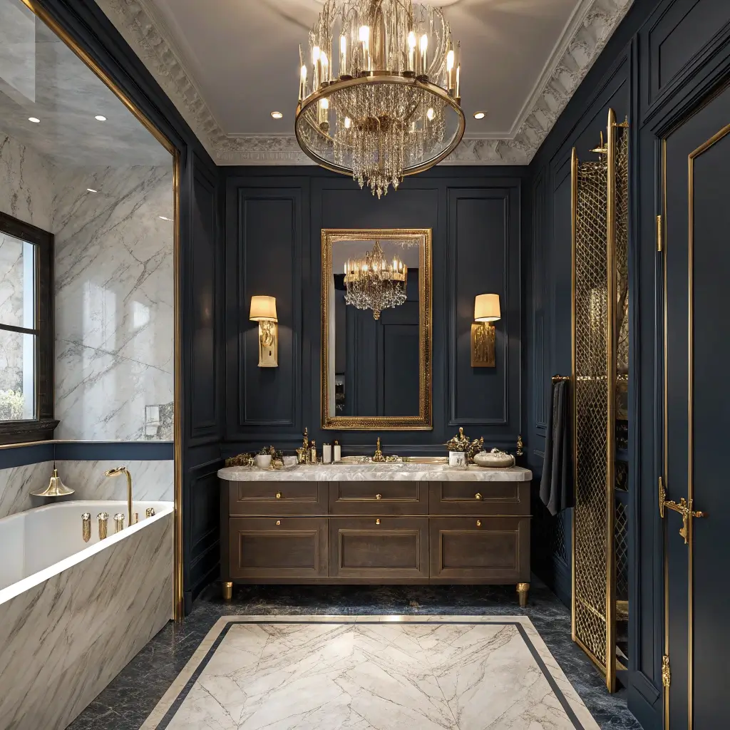 Alright, let’s talk about the midnight blue and gold glam bathroom, because honestly? This combination is chef’s kiss. There’s a reason this pairing has been popular since ancient civilizations – it just works.