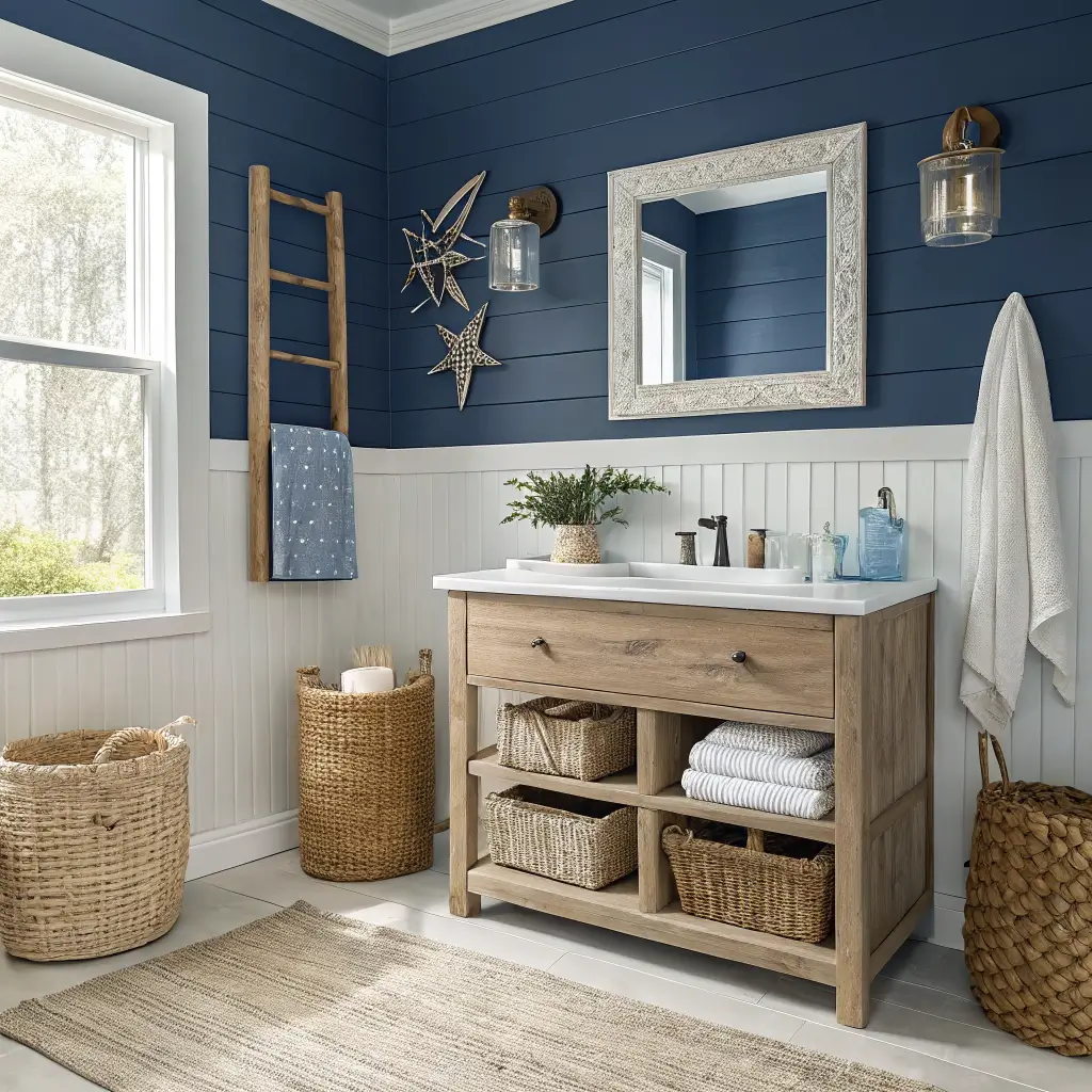 You don’t need to live near the ocean to capture that relaxed, coastal atmosphere. A deep blue coastal vibes bathroom brings the beach to you, minus the sand in uncomfortable places.