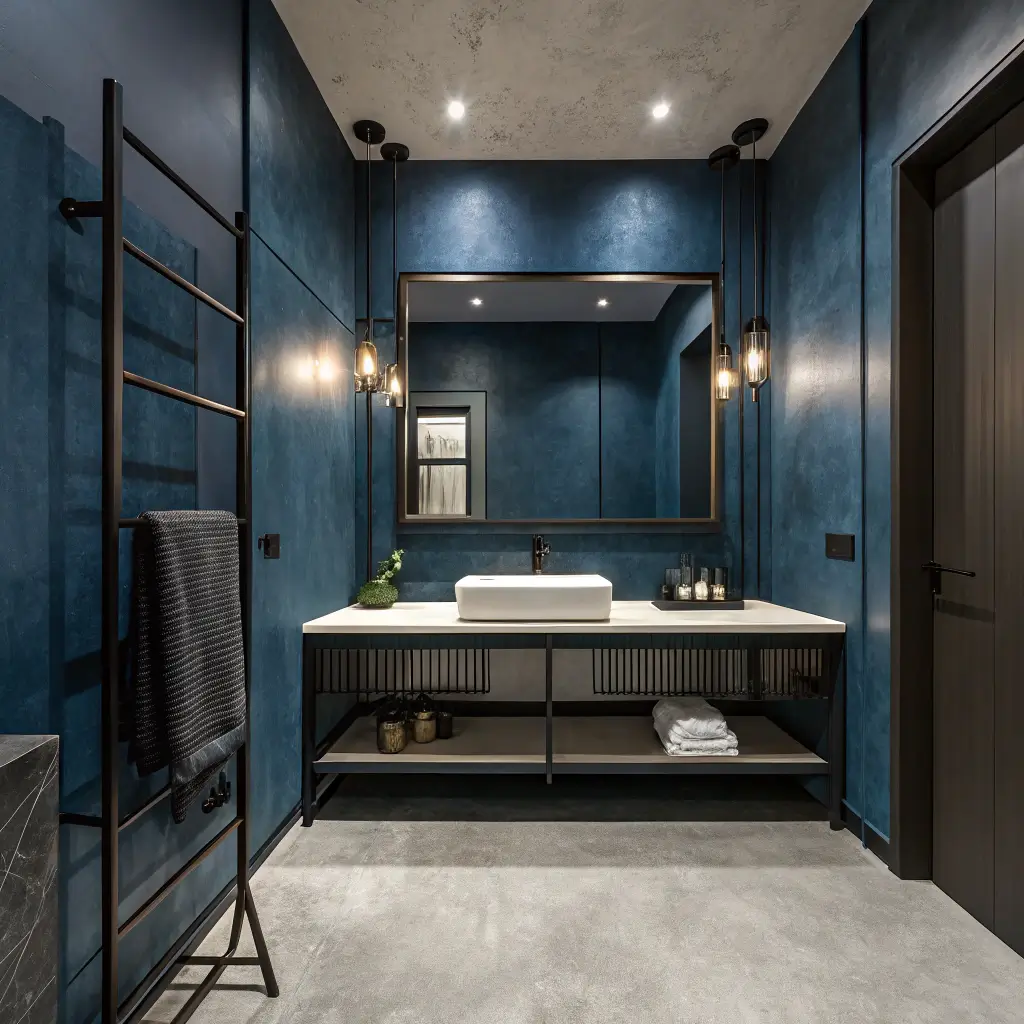 This style embraces midnight blue as the dominant color throughout the bathroom. We’re talking walls, cabinetry, and sometimes even the ceiling. It sounds intense, but when done right? Absolutely stunning.