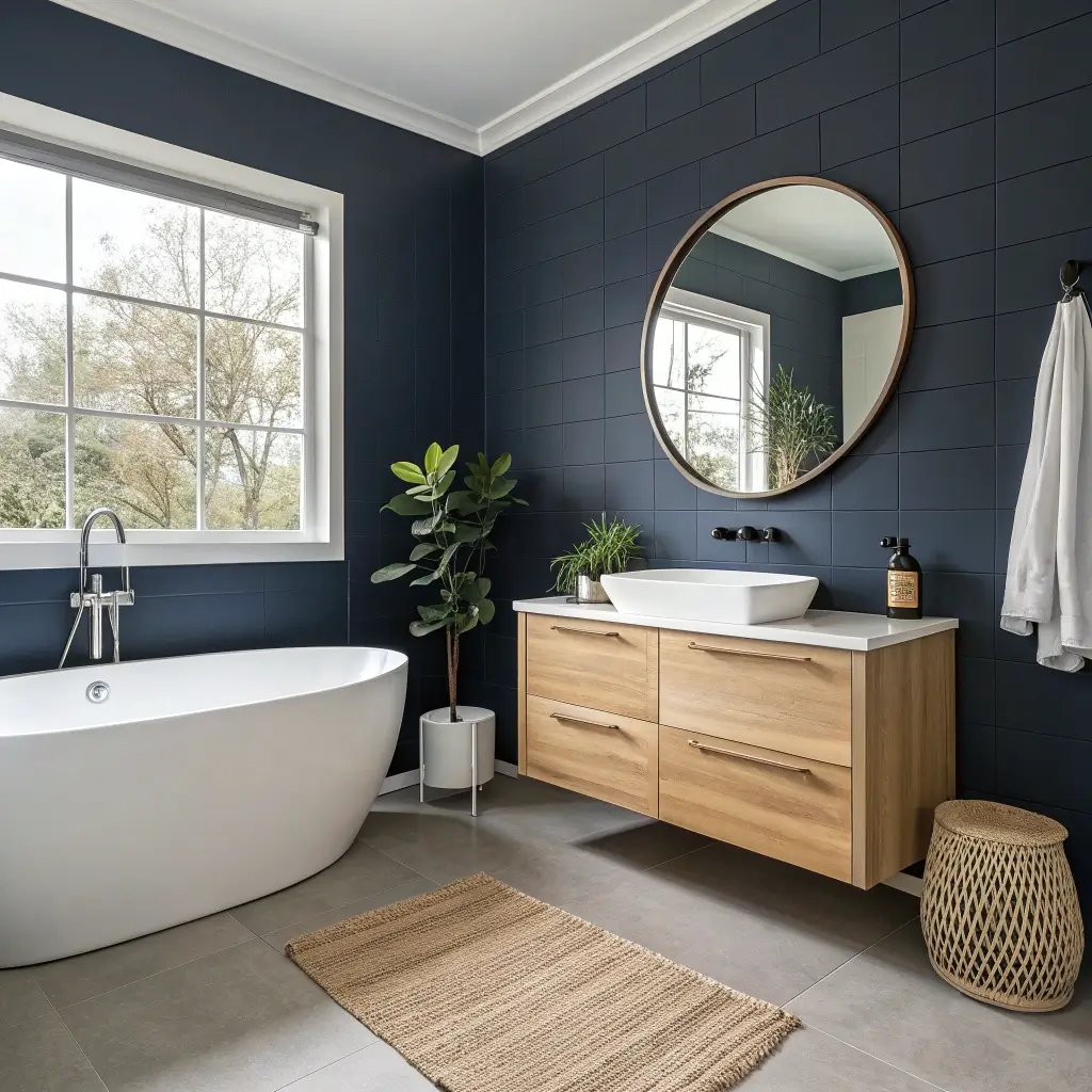 - Navy blue accent wall behind a freestanding tub (if you’ve got the space)