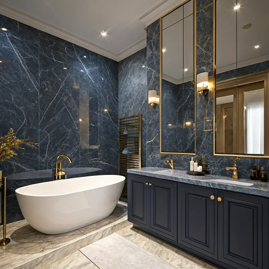 The veining in marble does some heavy lifting in these spaces. White marble with gray veining against midnight blue walls creates stunning contrast. For something warmer, consider Calacatta marble with its gold-toned veining – it bridges the gap between the cool blue and warmer accents.