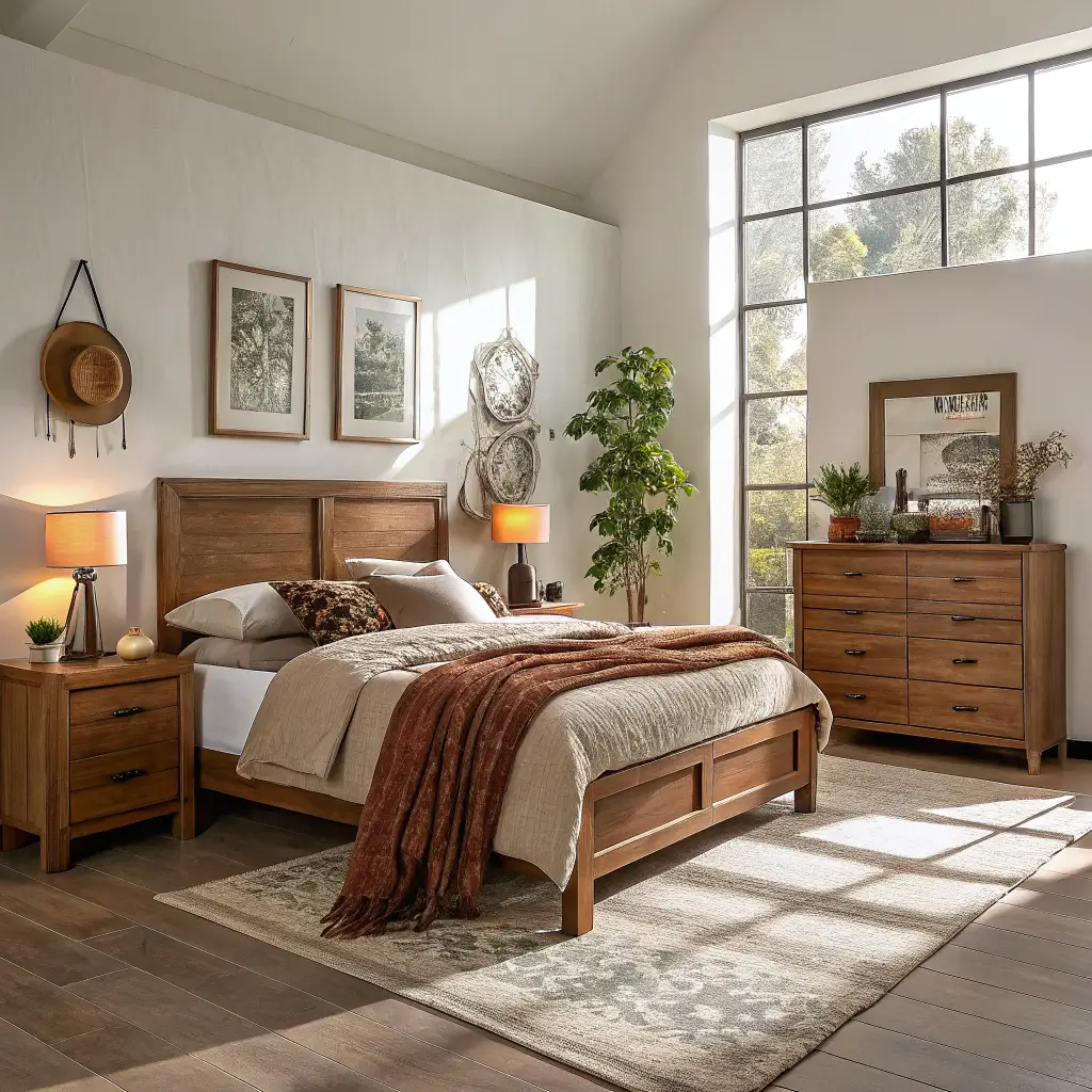 | Warm Wood | Matching wood dressers, woven baskets, floating shelves |