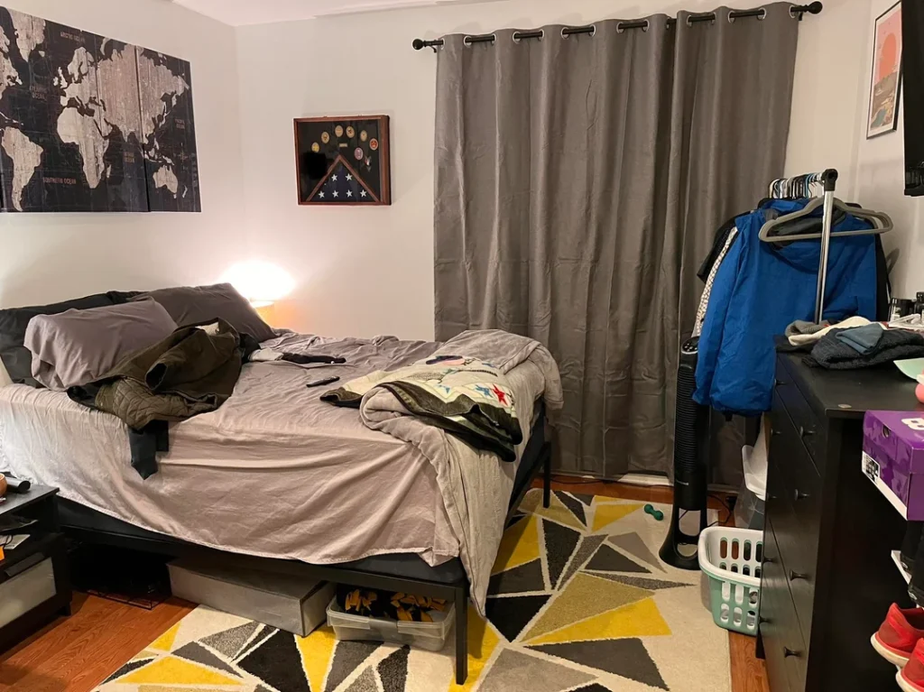 Not every bedroom needs to look like a showroom, and this one (credit: r/Shagen34) is proof. Simple grey curtains hang above the window, doing their job without demanding attention. The room itself feels lived-in and personal, with artwork on the walls, a colourful rug, and everyday clutter that makes it feel real.