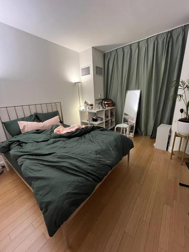 Green is having a moment, and it’s easy to see why. This bedroom (credit: r/xeniatay) features floor-length olive green curtains paired with matching bedding, creating a space that feels grounded, calm, and connected to nature.