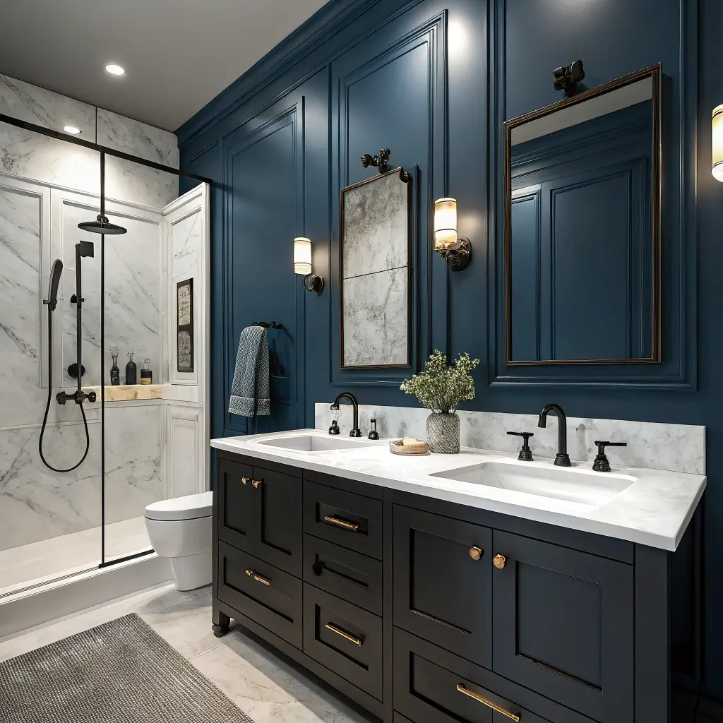 The beauty of moody blue? It’s versatile enough to work with whatever style you choose. Whether you go full drama with statement tiles and gold accents or keep things zen with floating vanities and minimal decor, that deep blue foundation elevates everything it touches.