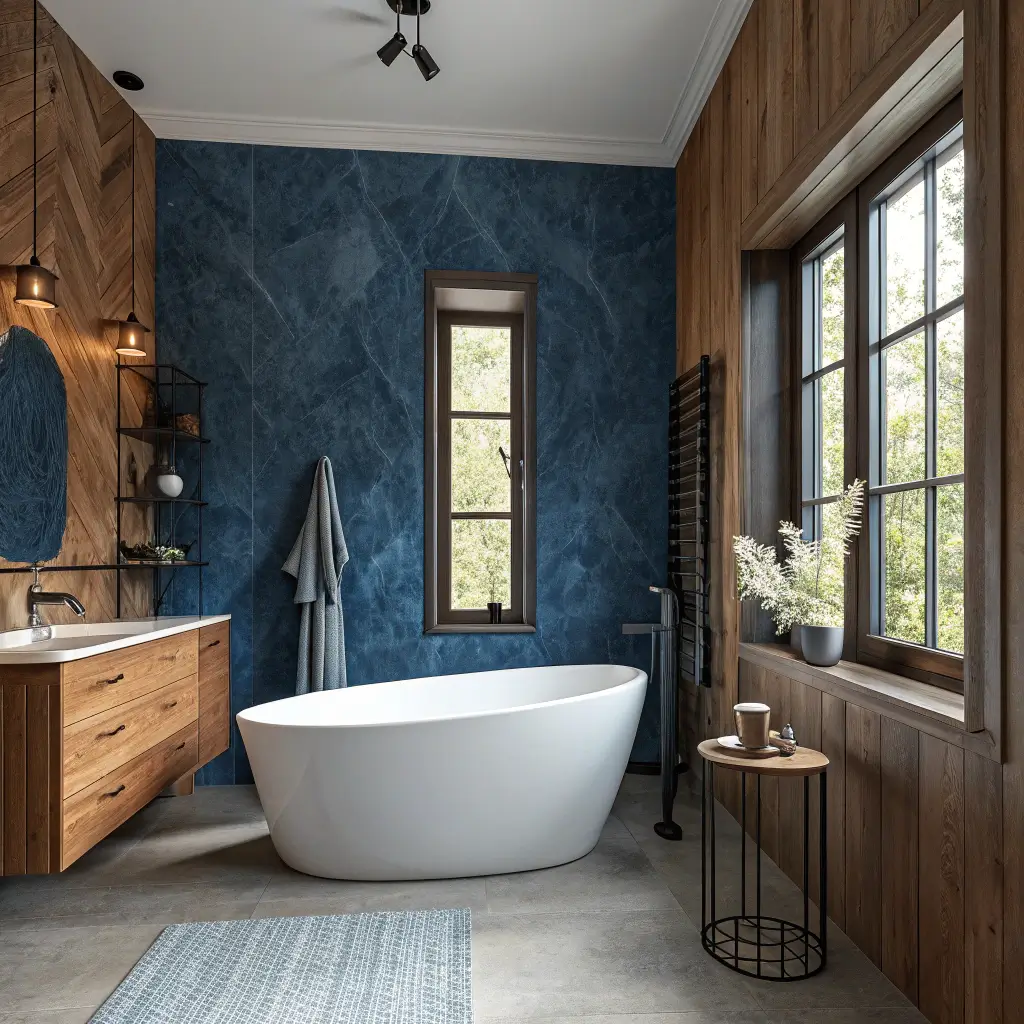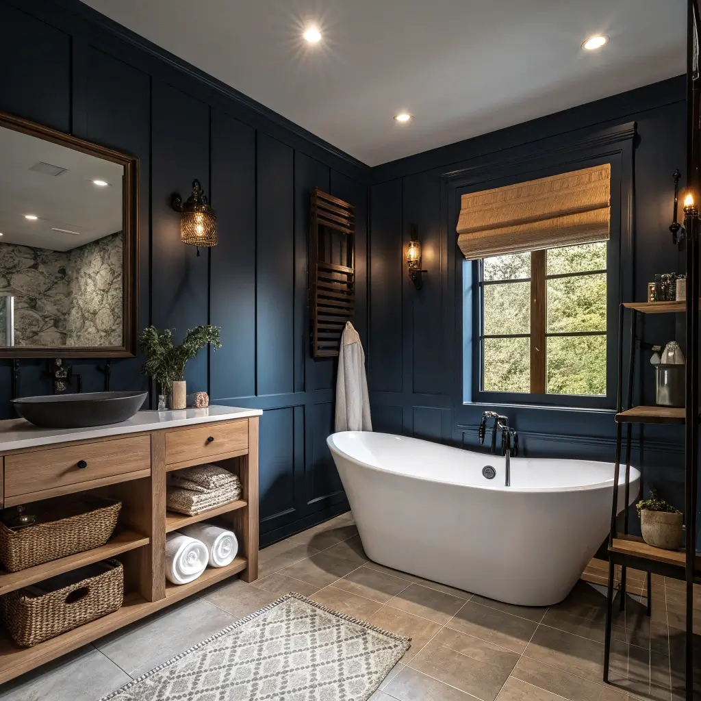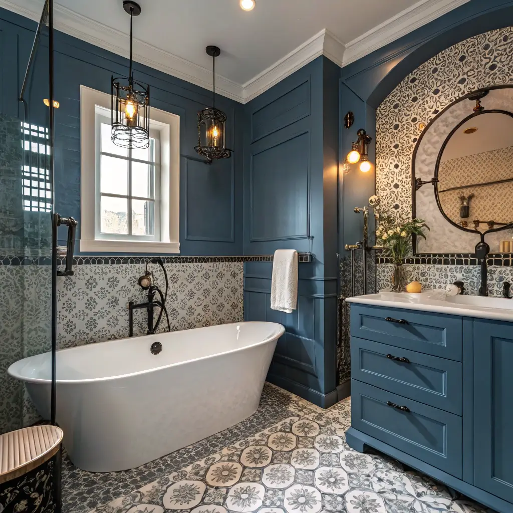 Why settle for boring when statement tiles exist? Combining bold tile patterns with moody blue creates visual interest that transforms your bathroom from basic to breathtaking.