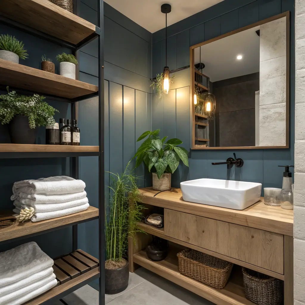Start small if you’re wood-curious. Add a wooden bath mat, floating shelves, or a mirror frame. You can always add more once you see how much warmth it brings to your moody blue space.