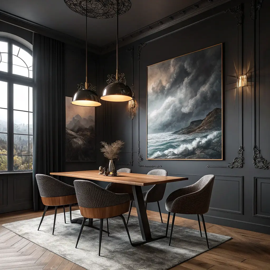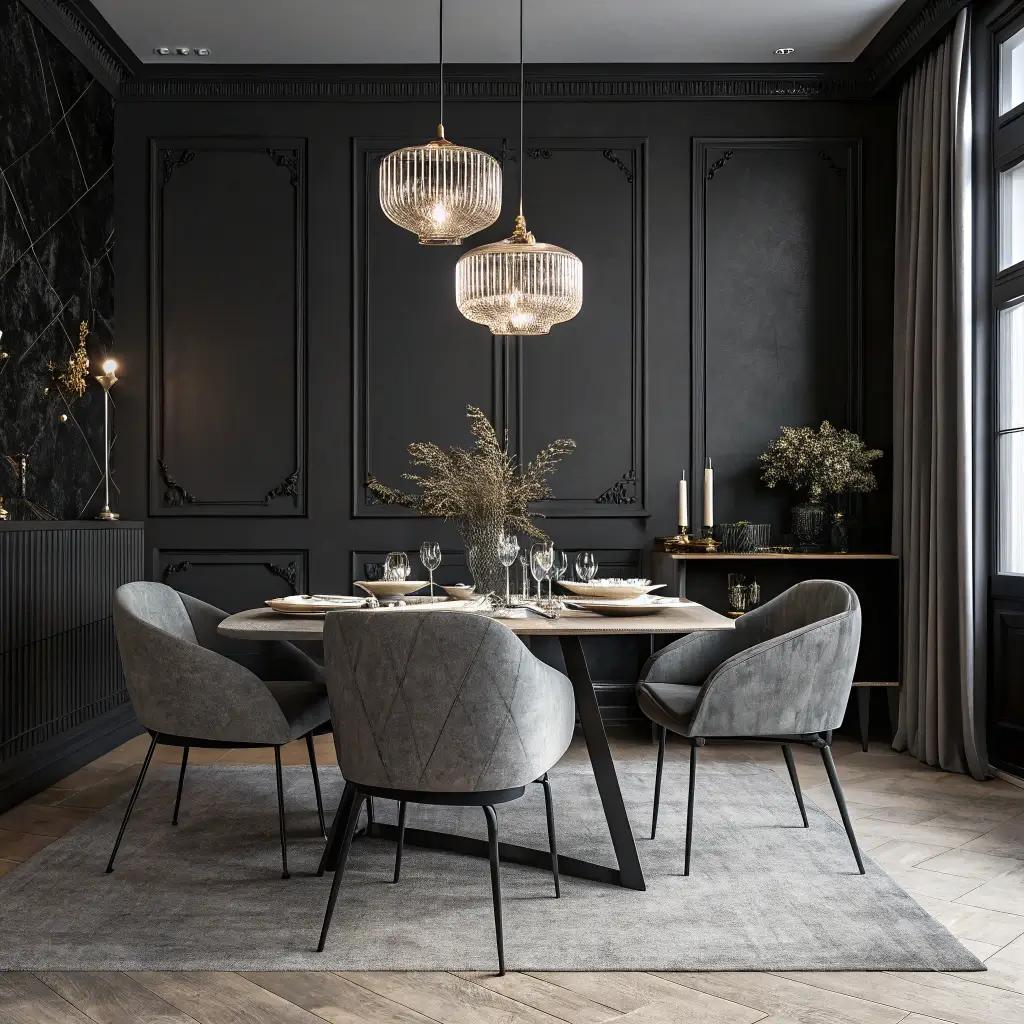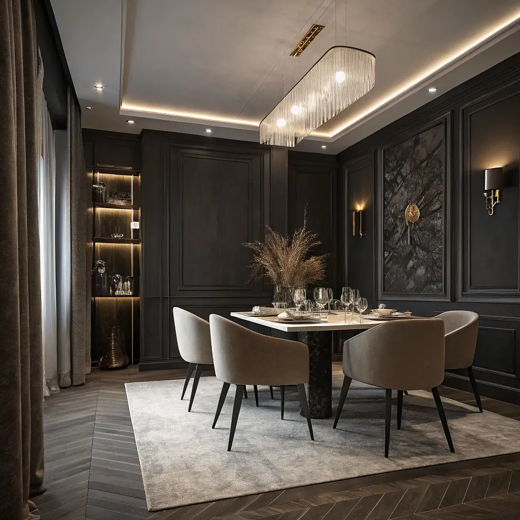 Picture this: charcoal walls, a simple black dining table, streamlined chairs, and maybe one perfect pendant light. That’s it. The beauty is in the simplicity and the quality of each element. Every piece needs to earn its place.