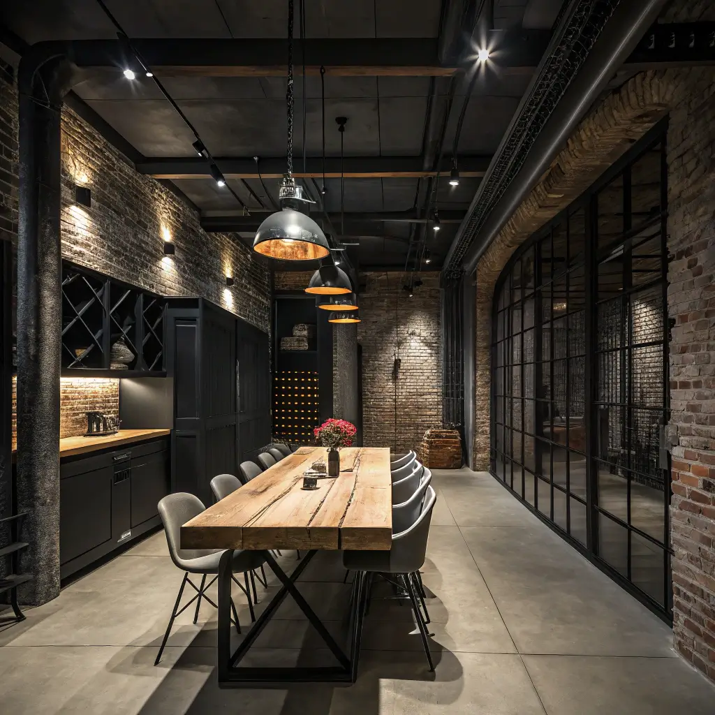 Who decided industrial design couldn’t be moody? Exposed brick, metal fixtures, and raw wood can create an incredibly atmospheric dining space when you approach it right. The key is embracing the shadows those hard surfaces create.