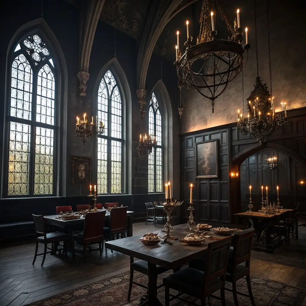 Incorporate Gothic elements through architectural details: pointed arch mirrors, ornate black metal chandeliers, or dramatic drapery. The color palette stays sophisticated – blacks, deep purples, burgundies, and rich browns.