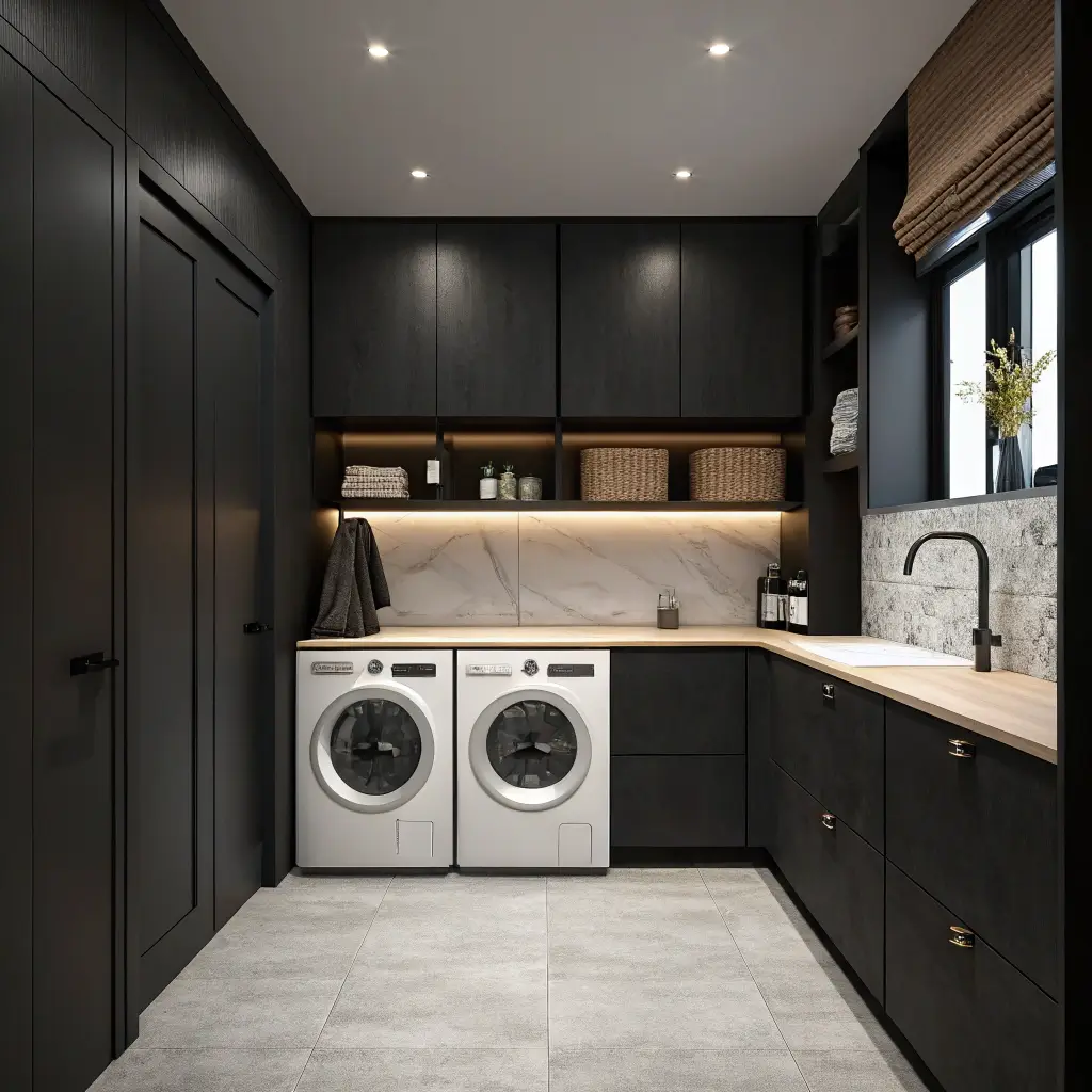 Black Cabinets with Warm Lighting Laundry Room