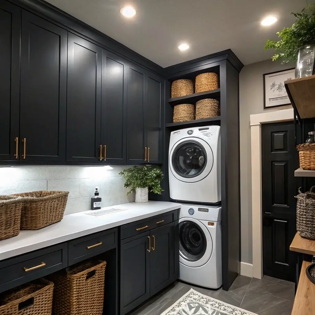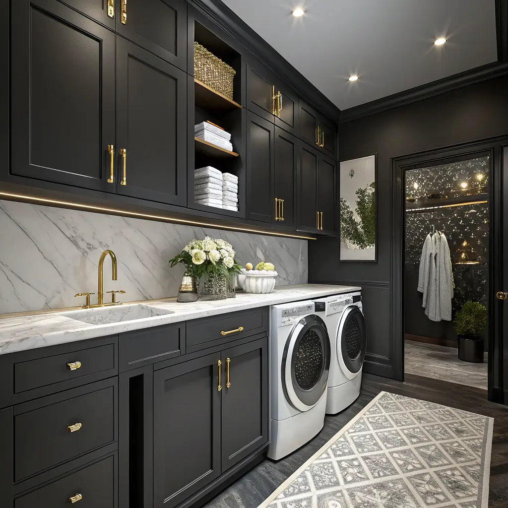 Ready to go full glamazon with your laundry room? Black and gold is the ultimate power couple in design. It’s luxe, it’s dramatic, and it makes doing laundry feel like less of a chore and more like a spa experience.