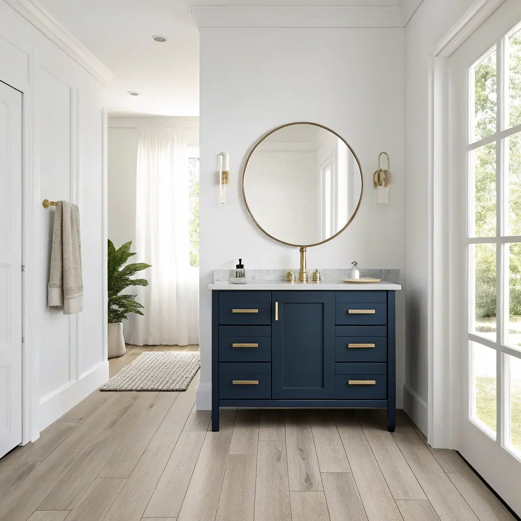 Combine your navy vanity with warm brass fixtures and soft textiles. Think plush towels, a cozy bath mat, maybe even a small upholstered stool if you have space. These elements soften the boldness of navy and create a welcoming atmosphere.