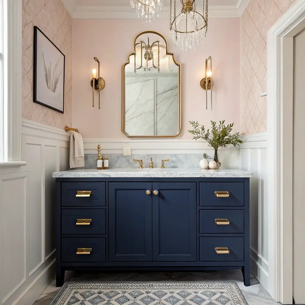Rules say don’t mix patterns. Unique style says do whatever makes you happy. Pair your navy vanity with patterned floor tiles AND patterned wallpaper if you want. The key is keeping the navy as your anchor color throughout.