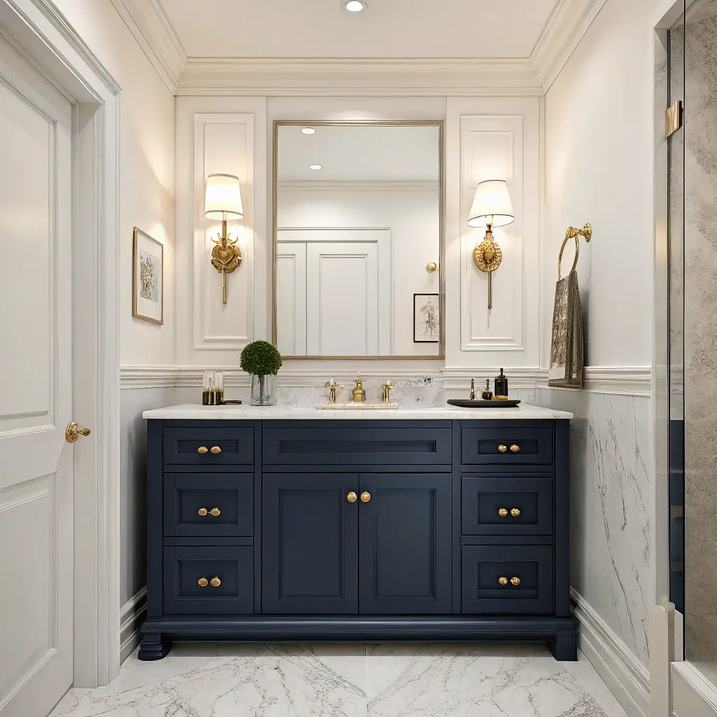 Elegant bathrooms nail the details. Crown molding, quality towel bars, proper ventilation – these aren’t the exciting parts, but they make the difference between “nice” and “elegant.” Your navy vanity sets the tone, but the details seal the deal.