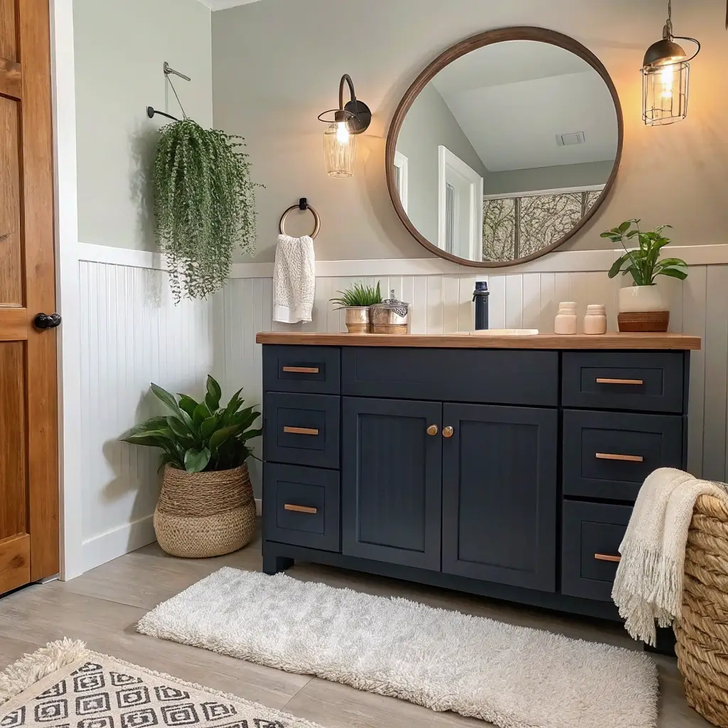 Smooth, glossy navy paint looks amazing, but have you considered adding texture? Beadboard or shiplap details on your vanity can add that extra layer of interest. Pair it with smooth walls and maybe a textured rug, and you’ve got yourself a chic little situation.