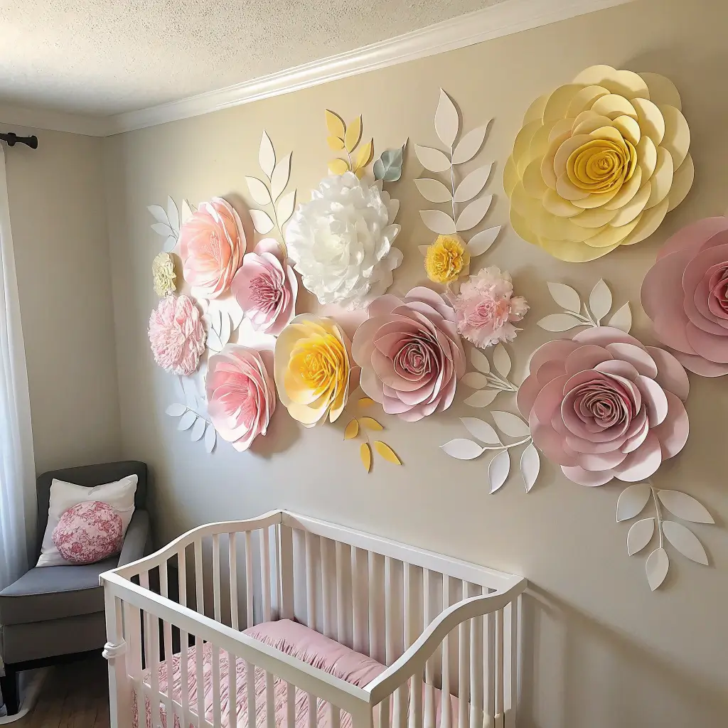 Three-dimensional paper flowers bring texture and whimsy to flat walls without the maintenance of real plants. They cast beautiful shadows, add depth to the room, and honestly? They’re surprisingly elegant when done right.