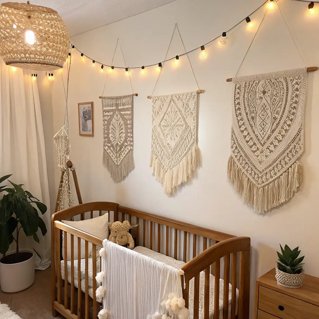 Macramé brings incredible texture to nursery walls, and the boho trend shows no signs of slowing down. The soft, natural fibers and flowing patterns create this organic, peaceful vibe that’s perfect for a baby’s room.