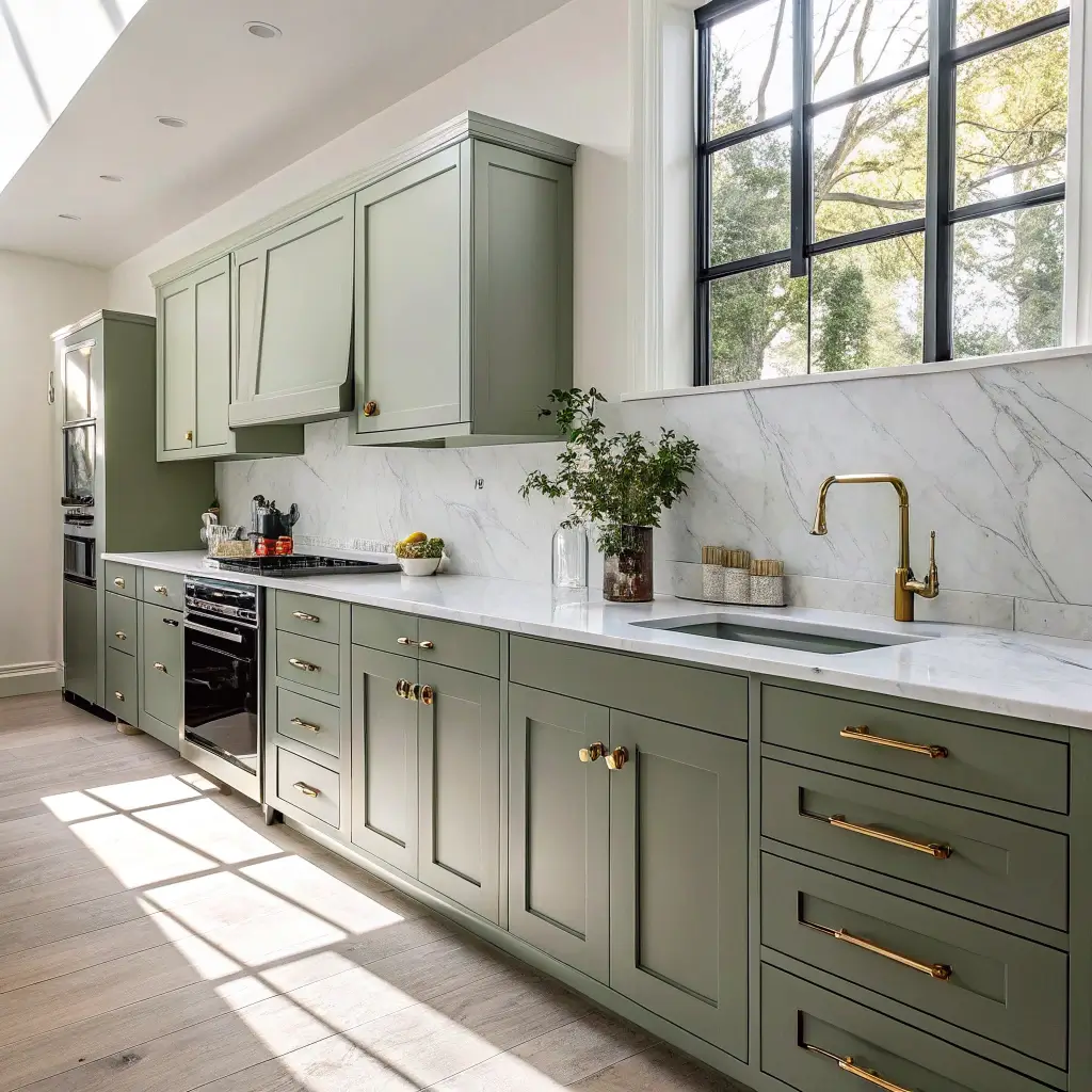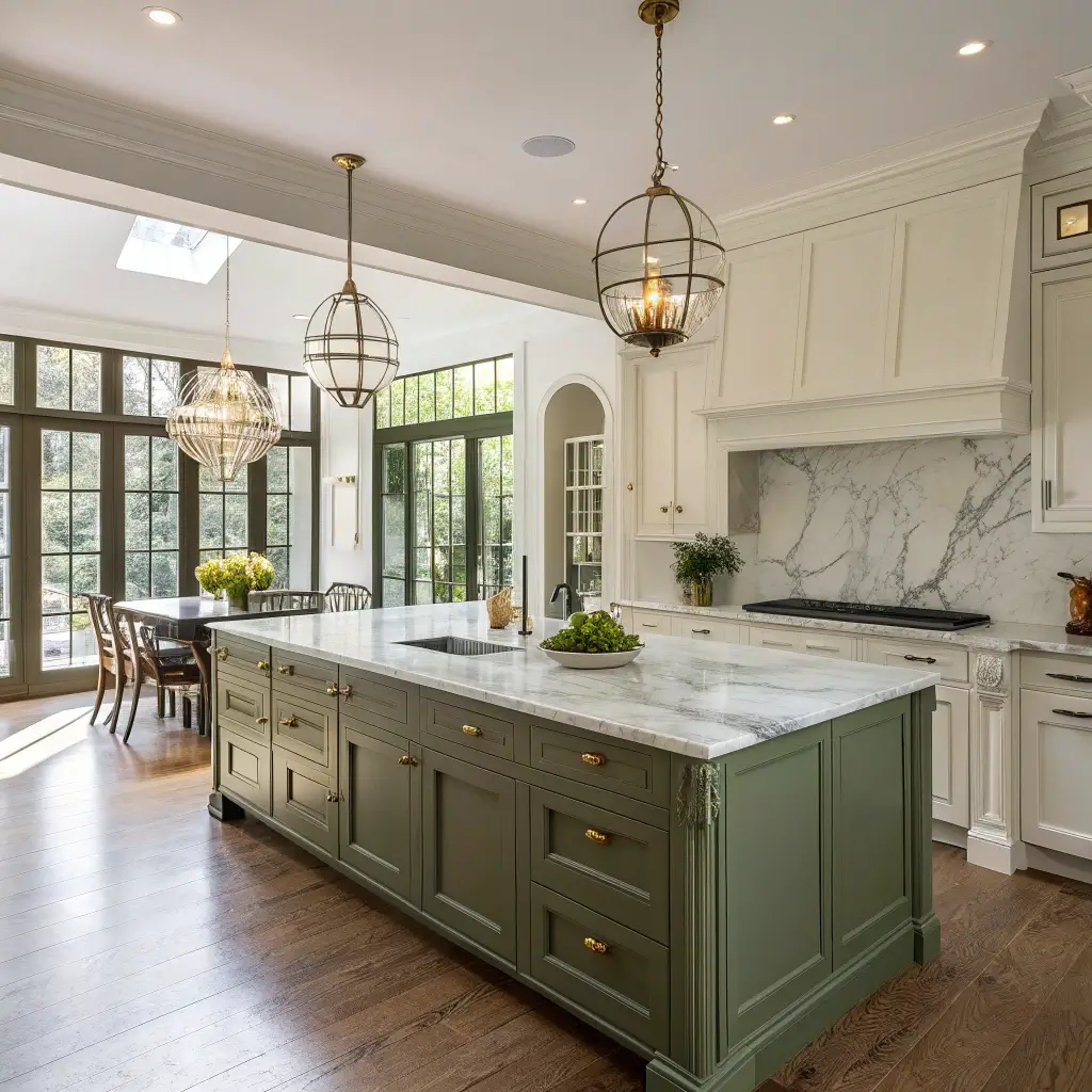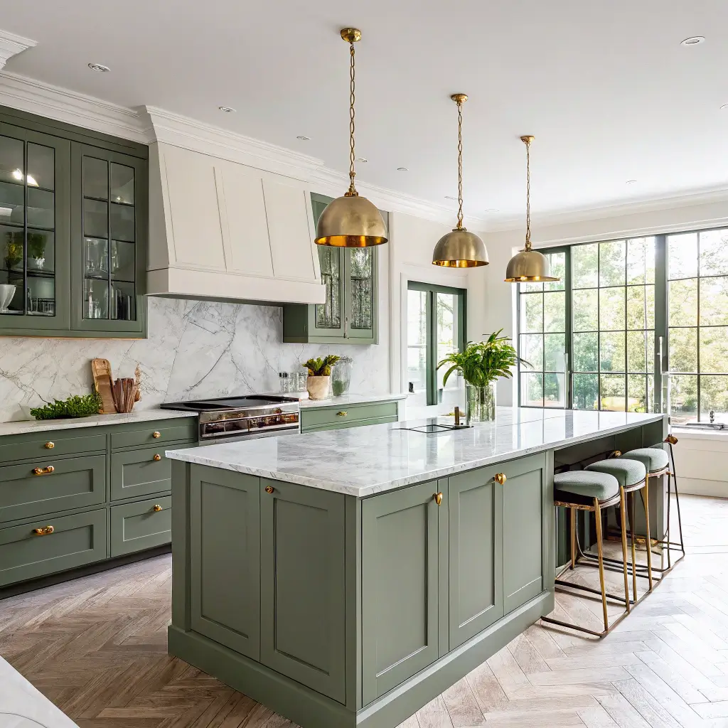 What really sells this combo is how it anchors your kitchen without overwhelming it. The olive green grounds the space, while the white marble keeps things bright and airy. You can go darker with your olive shade if you’ve got tons of natural light, or stick to a softer sage-olive if your kitchen runs a bit dim.