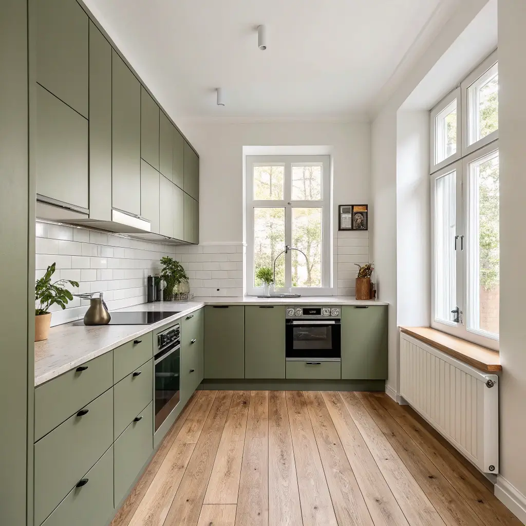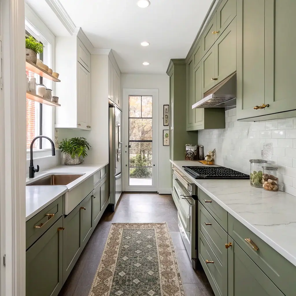 Galley kitchens get a bad rap, but honestly? They’re incredibly efficient, and olive green can make them feel special rather than cramped. The key is working with the narrow space, not against it.