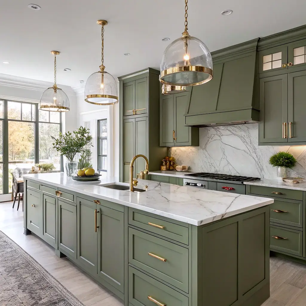 - Choose your finish wisely: Matte olive cabinets with polished marble = instant sophistication