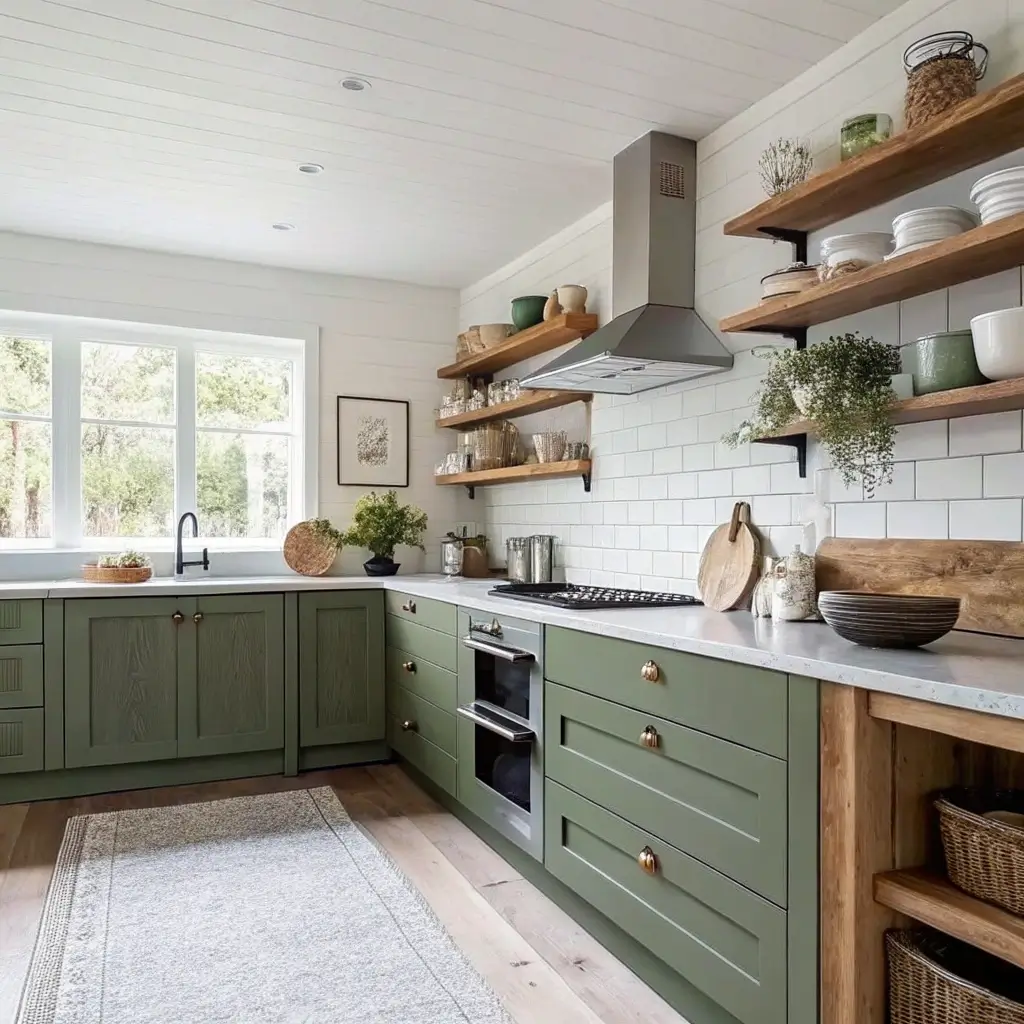 Consider doing just the lower cabinets in olive green while keeping uppers white or open. This grounds the space without making it feel cave-like. Or flip it – olive upper cabinets with a white lower section and countertops can actually make your ceilings look higher.