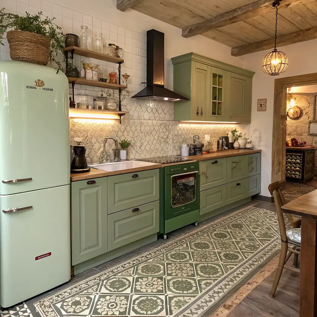 Going vintage doesn’t mean your kitchen has to look dated. It’s about capturing that retro charm while keeping things functional for modern life. Think vintage-inspired appliances in mint or cream paired with olive cabinetry. Or restored vintage pieces like an old Hoosier cabinet painted olive green.