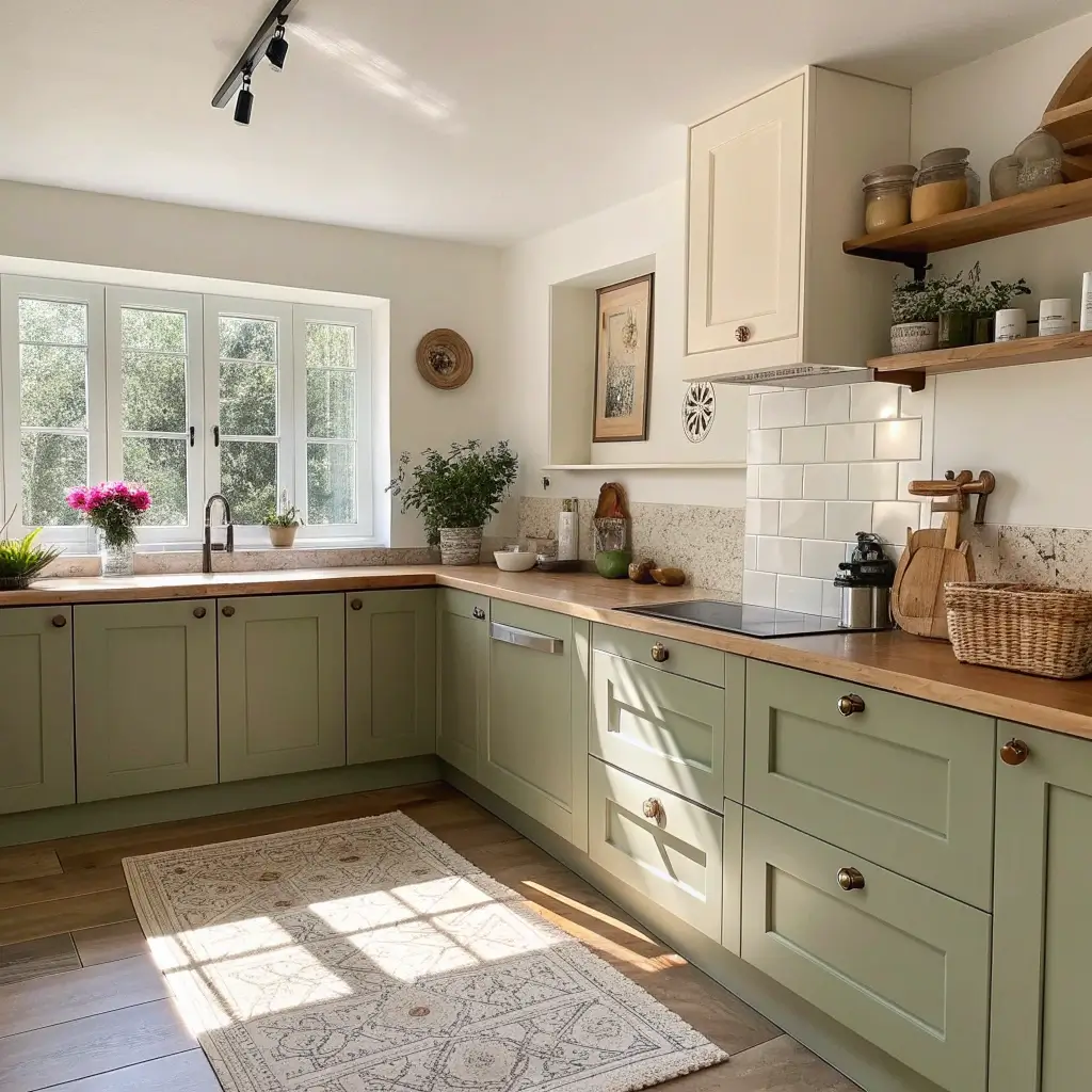 The farmhouse approach lets you go a bit wild with texture and character. Distressed olive green cabinets paired with a farmhouse sink? Yes, please! Add some open wooden shelving, maybe a vintage runner, and you’ve got yourself a kitchen that feels like it’s been loved for generations.
