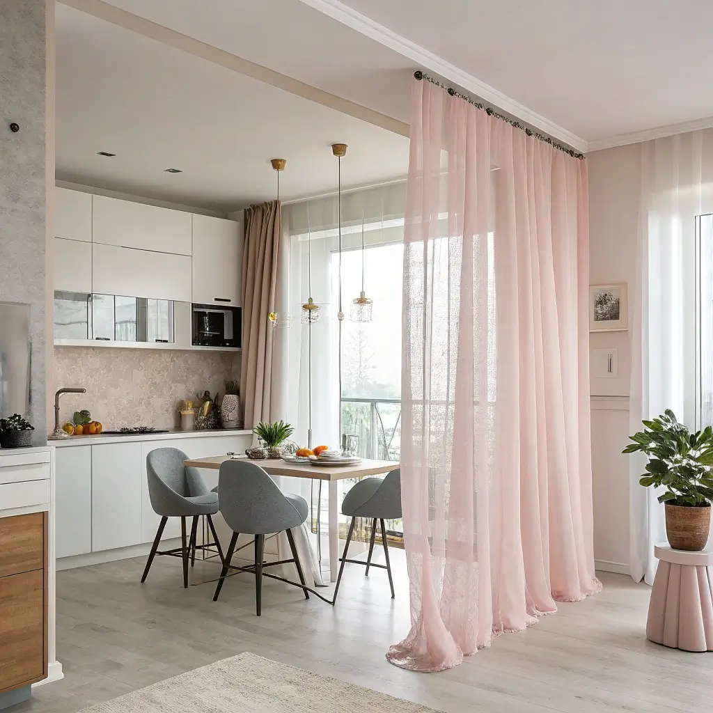 Sometimes the simplest solutions work best. Hanging curtains between kitchen and living areas might seem basic, but done thoughtfully, this approach delivers serious style and function.
