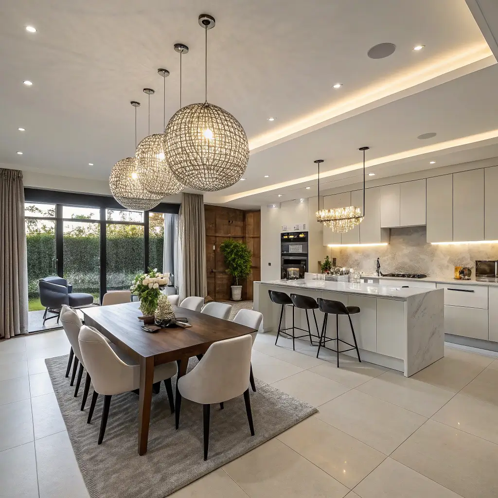 Your kitchen needs bright, functional task lighting. Your dining area deserves a show-stopping pendant or chandelier. And your living zone? A mix of floor lamps, table lamps, and maybe some architectural lighting to create mood.