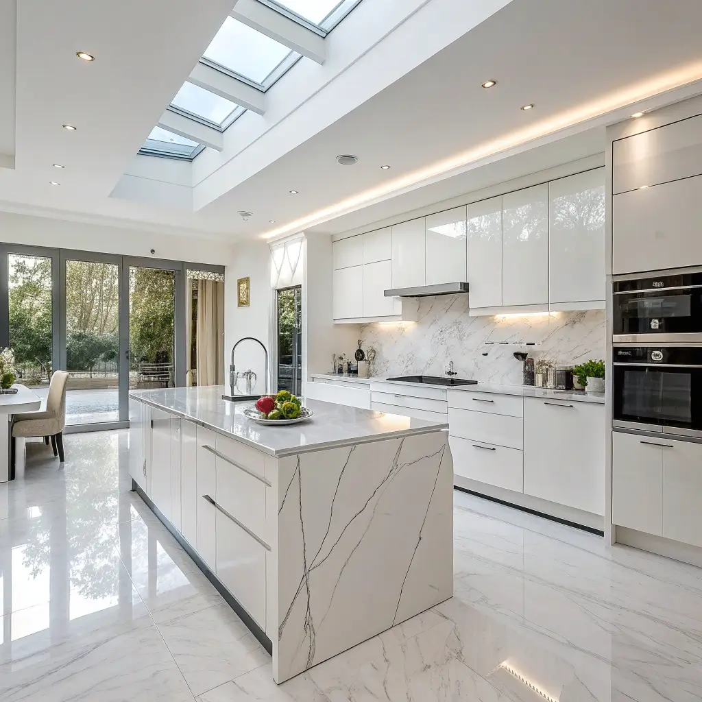 Let’s talk about the kitchen that never goes out of style. A modern white open plan kitchen with a marble island screams sophistication without trying too hard. It’s the little black dress of kitchen design.