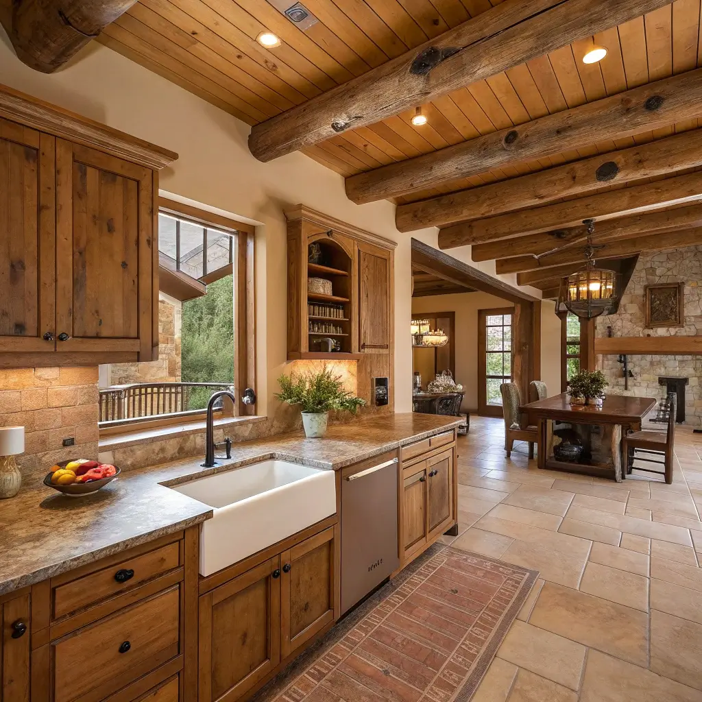 Rustic open plan kitchens embrace imperfection. Knots in wood, weathered finishes, and slightly mismatched elements tell a story. In a world of perfect Pinterest kitchens, this style offers refreshing authenticity.