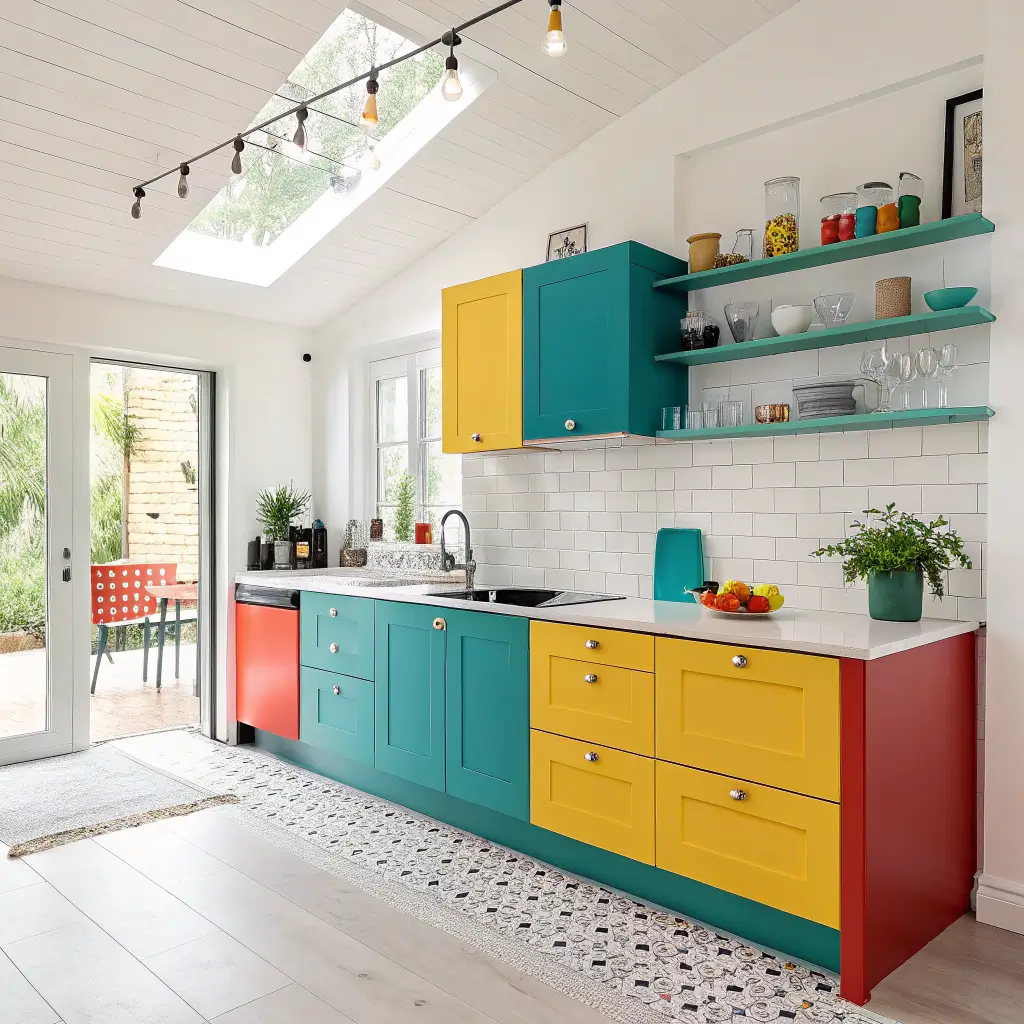 Colorful Open Plan Kitchen with Bold Cabinets