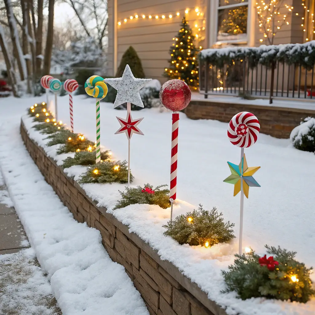 I make mine using wooden dowels, foam board, and weatherproof paint. Cut out shapes like presents, candy canes, or snowflakes, paint them up, and stake them throughout your garden beds. It’s like your plants are celebrating too!