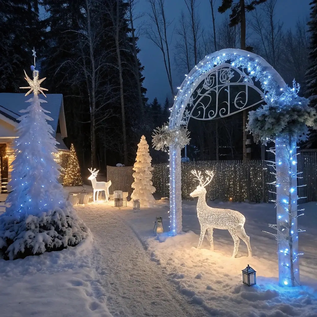 Add metallic ornaments and ribbons in both colors throughout your yard decorations. Silver branches (spray-painted or bought) in planters, gold stars on stakes creating constellation patterns across your lawn. The key is balance—never let one metal dominate.