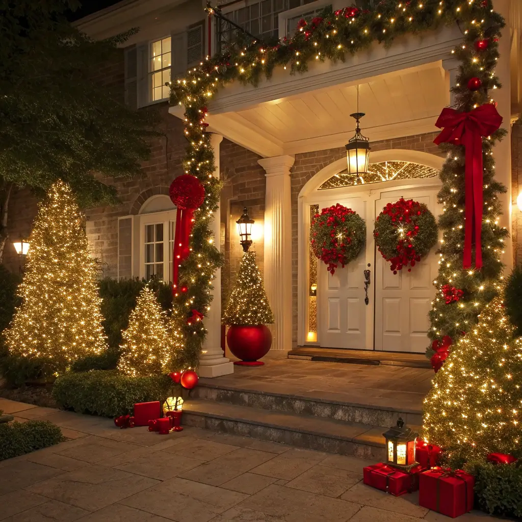I structure this theme around large red bows—and I mean the good ones, not those sad, flat things that look defeated after one rain shower. Weather-resistant velvet bows on every window, wrapped around porch columns, and adorning your front door create instant elegance.