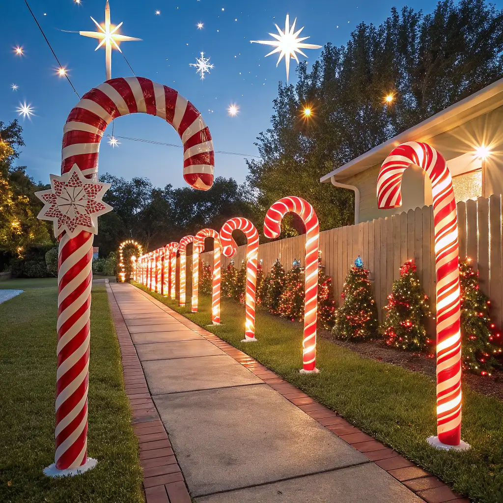 Those solar candy cane path lights you see everywhere? Buy twice as many as you think you need. Line your entire driveway, walkway, and garden borders. The repetition creates this amazing rhythmic visual that guides visitors right to your door.