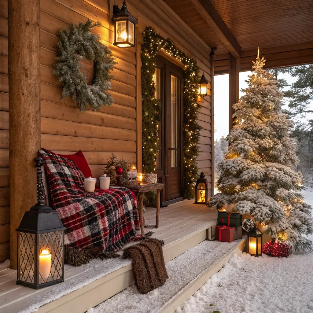 Layer plaid blankets on porch furniture (yes, even if no one’s sitting outside in December). Buffalo check patterns in red, green, or navy instantly signal “cozy cabin vibes.” Add some faux fur throws for extra warmth visual.