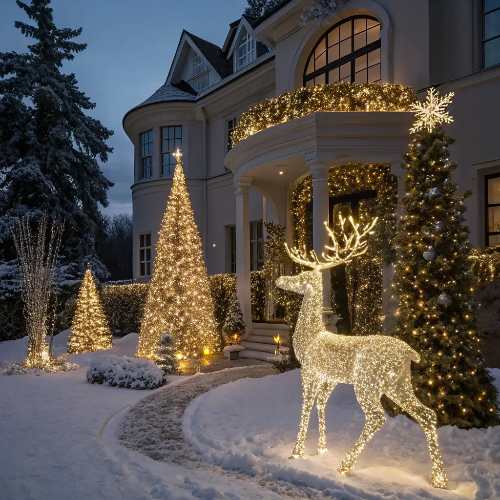 Focus on monochromatic white elements with clean lines. White wire reindeer sculptures, simple white light strands following your home’s architecture, and strategically placed white lanterns create elegance without chaos.
