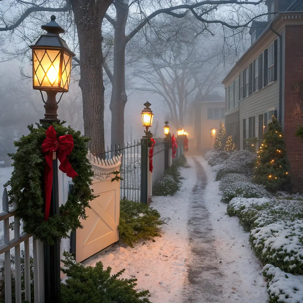 Creating a lantern-lit pathway brings old-world charm that makes your home feel like a Victorian Christmas card. This approach works especially well if you have a longer driveway or walkway.