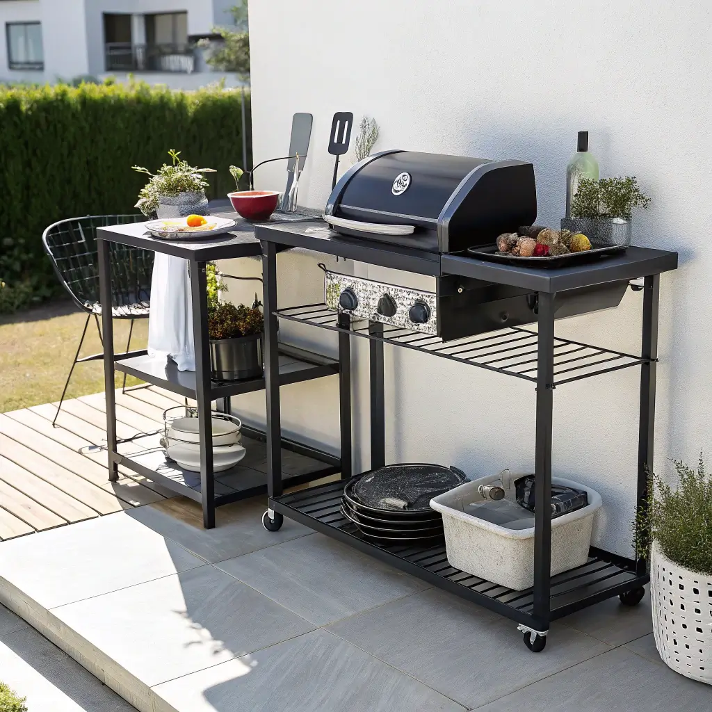 Position your grill in front, use the shelves for storage and prep space, and add a cutting board on top for a work surface. The open design means no water pooling, and cleanup involves literally just hosing it down.