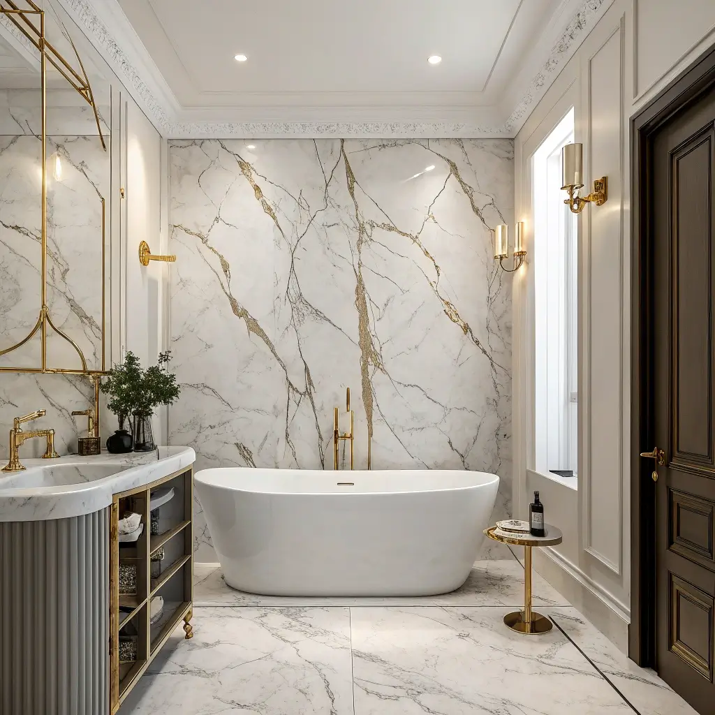 • Black + white marble accents – High contrast drama